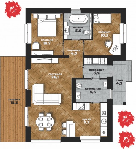 Удачное размещение котельной, между кухней и прихожей, позволяет использовать хоз. помещение в разных назначениях: как кладовую или постирочную, так же здесь удобно разместить лапомойку для домашних питомцев.